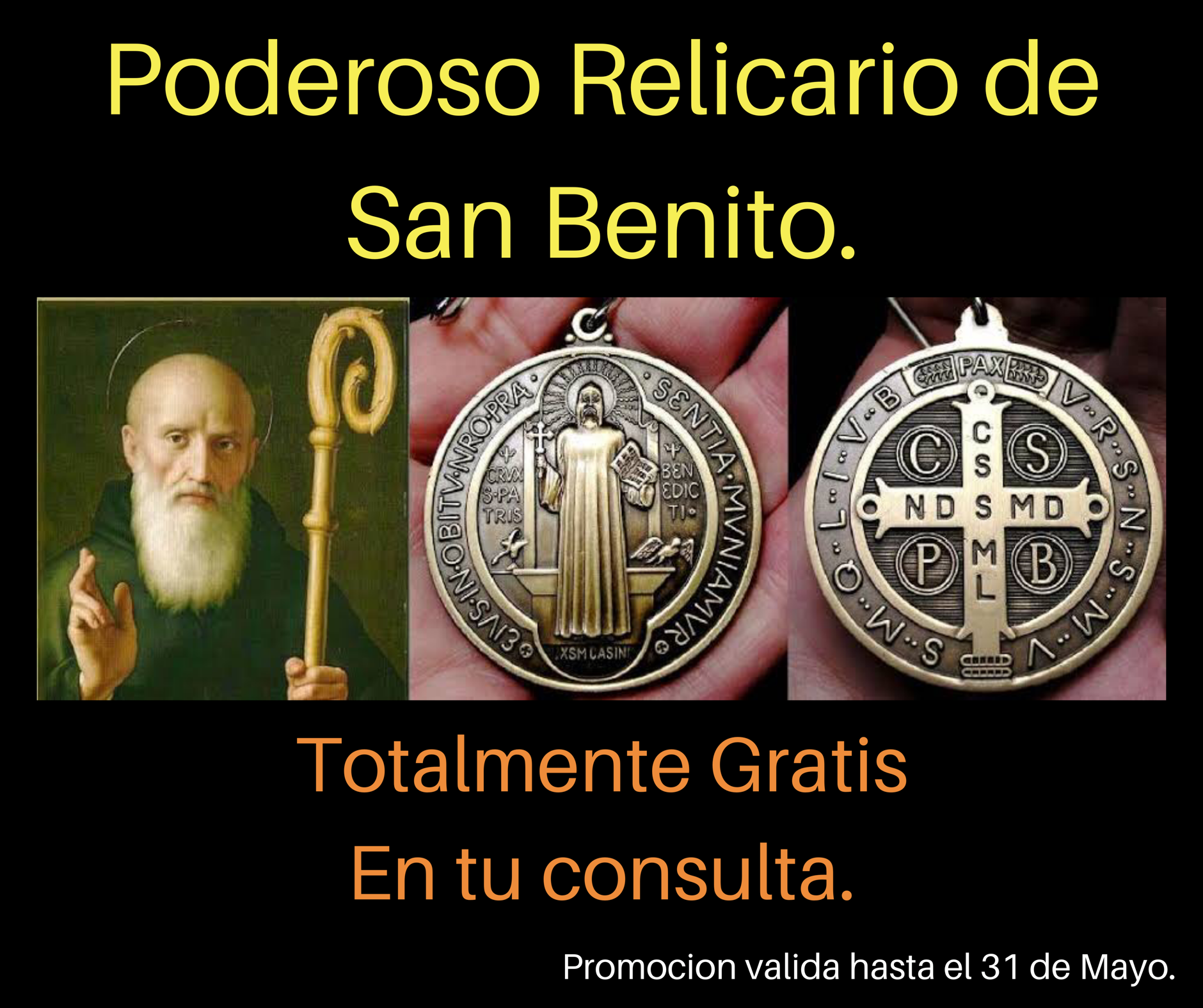 Por promoción del mes de mayo, relicario de San Benito, consagrado, totalmente gratis en tu consulta!