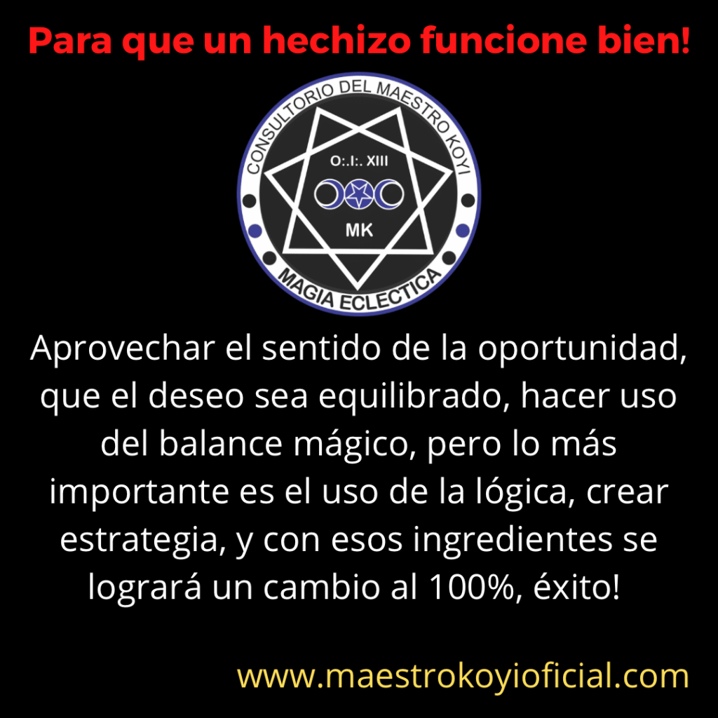 Aprovechar el sentido de la oportunidad, se refiera a la temporalidad, siempre es bueno observar si se está a tiempo de resolver un problema, por ejemplo un problema con la pareja, se puede resolver si el problema sucedió en el lapso de dos o tres meses, y si todavía no ha habido consecuencias que hagan que el problema no tiene remedio, no es bueno tratar de resolver algo qué pasó hace más de una año, equilibrio, que el hechizo sea equilibrado, que no sea injusto, que no sea para hacer el mal o perjudicar a alguien con medios mágicos, balance mágico es aprender a mover el hechizo conforme se están acomodando las cosas, recuerda que todos tenemos un libre albedrío y el influjo mágico mueve algunas cosas que pueden favorecer el resolver problemas, por eso es necesario checar constantemente el oráculo para saber y aprovechar los cambios, es necesario que el consultor sea bueno para crear una estrategia que ayude a aprovechar todos estos factores que ya hemos mencionado,todos podemos realizar un hechizo, no se necesita de un don en sí, pero, si de un conjunto de habilidades, por eso es bueno elegir un buen brujo o mago, que no solamente se base en la lectura oracular, en recetas espirituales, ya que un hechizo si lleva una base, más no es una receta, se trata de usar el poder equilibrante de los elementos naturales, mover energías y no solamente seguir lo que nuestro astrólogo favorito dijo en el radio que hiciéramos, excelentes resultados mágicos!