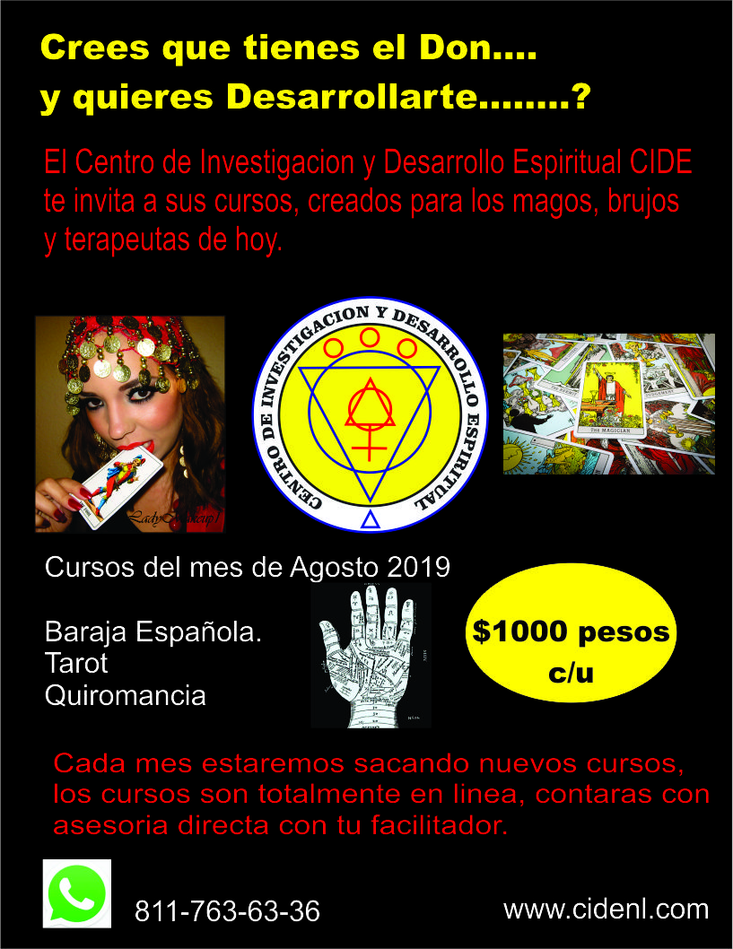 Cada mes estaremos preparando varios cursos, este mes de Agosto tenemos el curso de Baraja Española, Lectura de la Mano y Tarot, tos prepartados de una manera nemotecnica de aprender, haciendo facil y divertido el aprendizaje, en menos de una semana podras realizar una consulta como todo un profecional, los cursos son en linea.